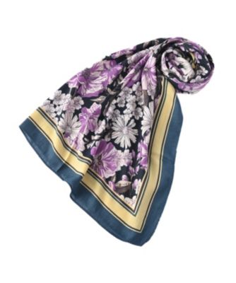 寒色系の花柄ににイエローの縁取りが効いた大判ストール。首元・肩・バッグ、マルチに使えるアイテムです。