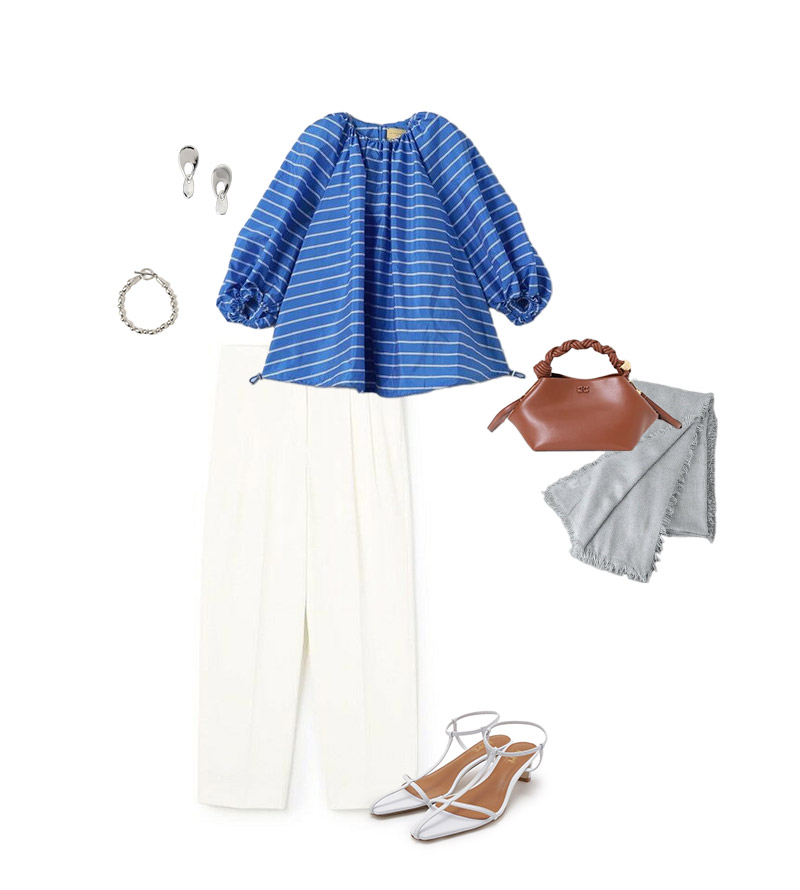 白パンツ×ブルーブラウス