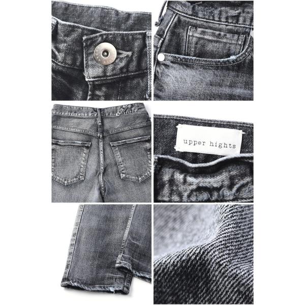 絶妙なダメージ感がたまらないupper hightsのブラックユーズドカラー。まだまだ残暑厳しい時期、ダークグレーのノースリーブトップスをウエストインで着こなして。