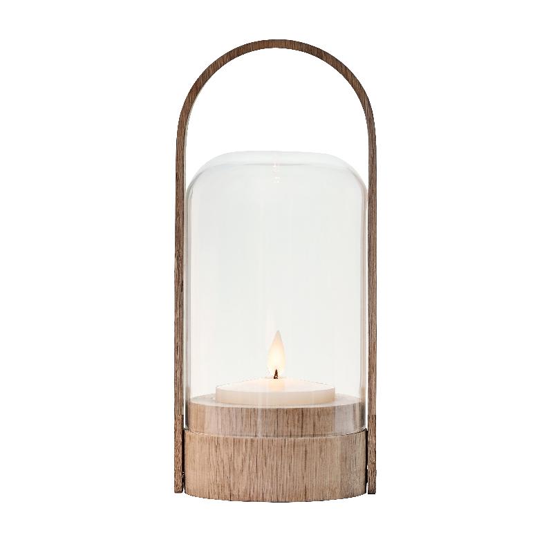 LEDの炎が揺らめく、北欧デンマーク製のランタン。オーク材のハンドル×ガラスの異素材コンビが懐かしく暖かいですね。