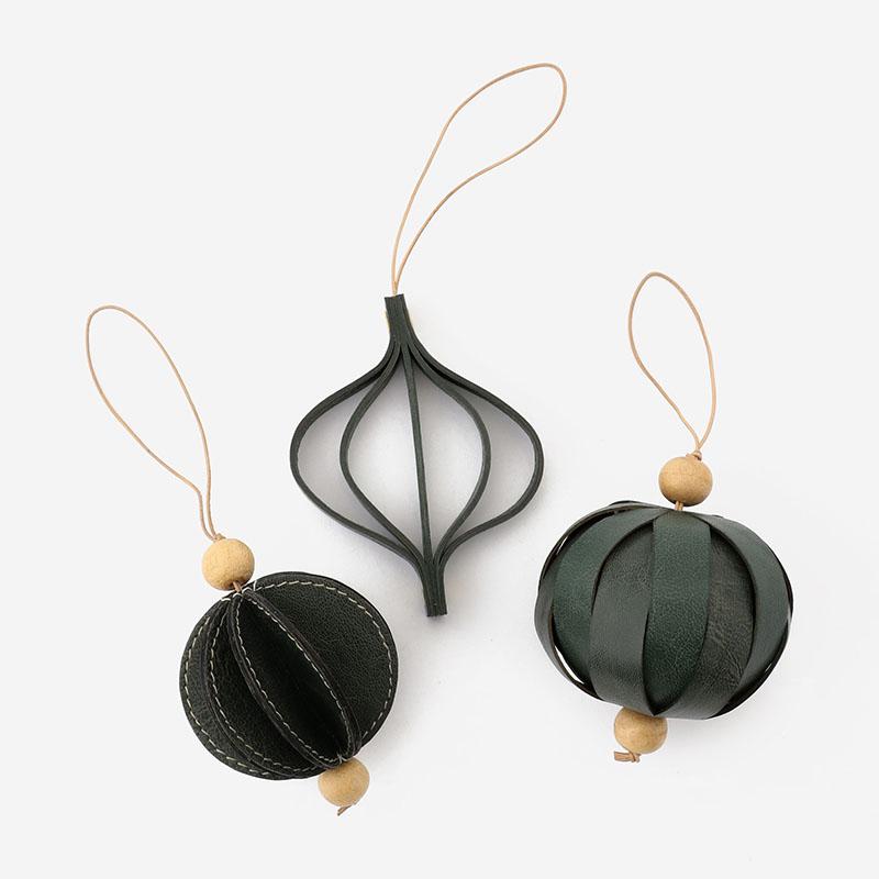 高級感のあるレザー素材のオーナメント。こちらのグリーンの他、ブラウンとグレーの3色展開。