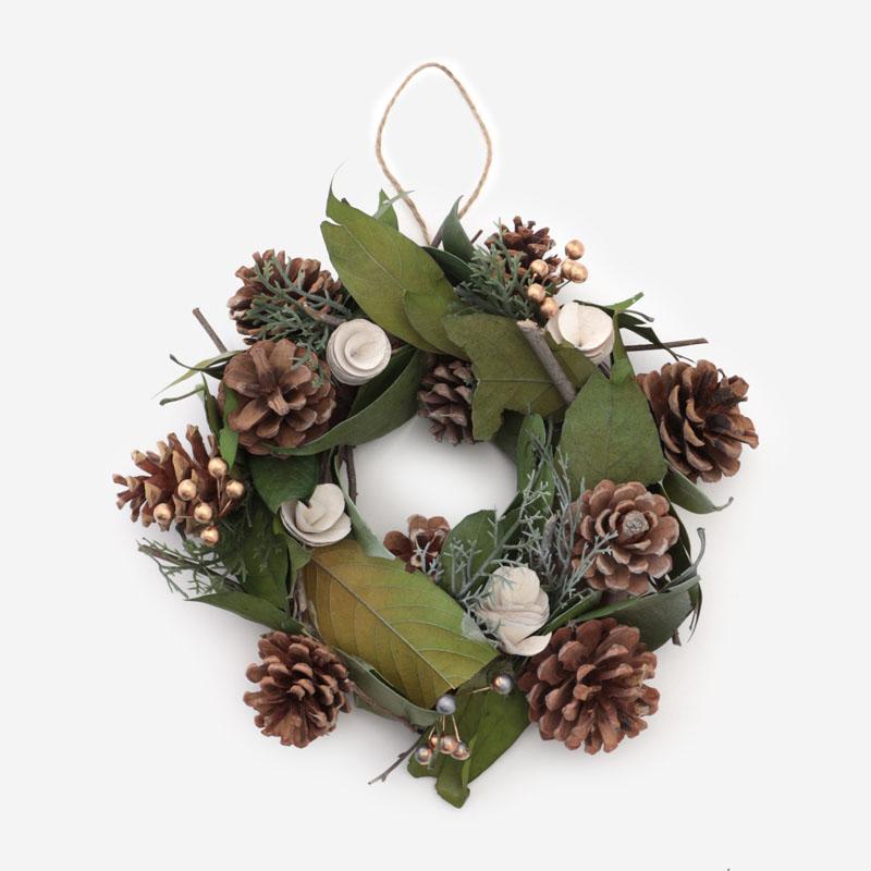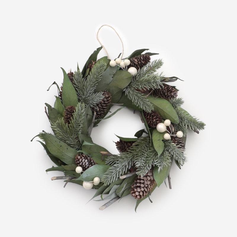 リアルな質感と使いやすさが魅力のクリスマスリース。グリーンに白が美しく映えますね。