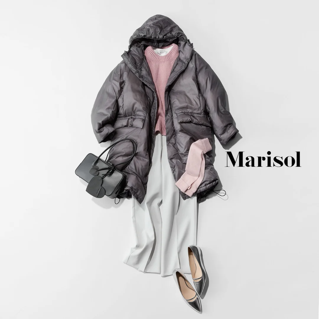 ベージュのニット×グレーのワイドパンツのベーシックカラーコーデに、スポーティーなベビーピンクコートを羽織ったミックスコーデ。