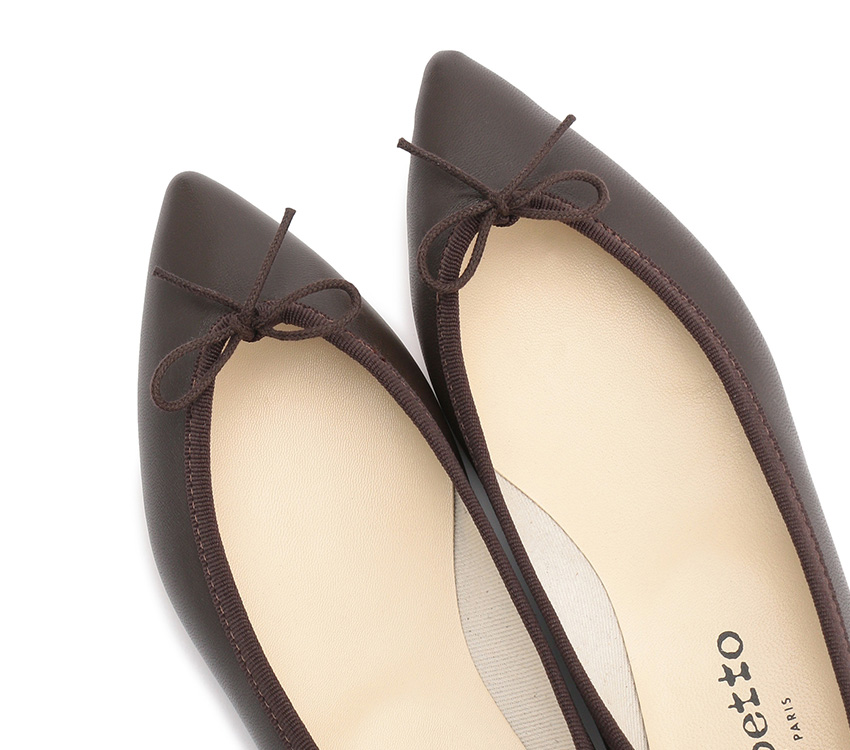 レペットのコレクション中では新鮮な、ポインテッドトゥのバレエシューズ。シックなブラウンのバレエシューズはマルチに活躍する1足。